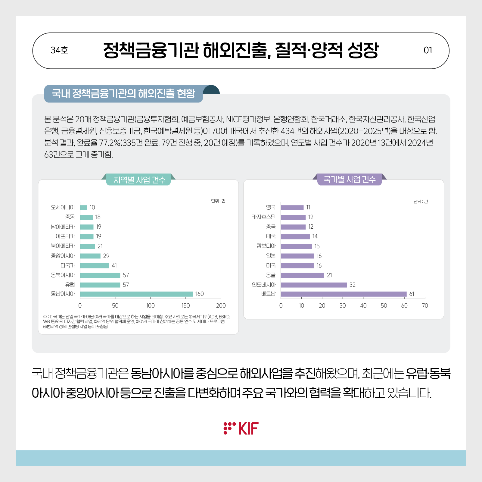 정책금융기관의 해외진출 현황과 시사점정책금융기관들의 해외진출이 양적·질적으로 확대되면서 한국형 금융발전 모델이 글로벌 금융협력의 중요한 축으로 부상하고 있음. 주요 정책금융기관들의 해외사업은 동남아시아를 중심으로 진행되고 있으나 유럽, 중앙아시아 등으로 점진적 다변화가 나타나고 있으며, 기술지원·컨설팅과 네트워킹 활동을 통한 노하우 전수가 주요 협력 방식으로 자리잡고 있음. 특히 증권시장 인프라, 중소기업 금융 생태계 구축 등 기관간 전문성을 결합한 패키지 모델이 새로운 협력 방식으로 발전할 가능성을 보이고 있음. 향후 신흥시장 진출 확... 금융포커스 이대기국내은행권 자금흐름 동향과 유가증권 투자 여력 점검국내은행의 여유자금(=총수신-여신)은 예년과 달리 올해 상반기 감소하였고, 3분기에도 계절적 요인으로 감소할 것으로 보여 현재 여유자금이 풍부한 상황으로 판단하기 어려움. 일반적으로 여유자금의 감소는 은행권의 유가증권 투자 여력을 낮추는 요인으로 작용함. 최근 은행권의 사회적 역할에 대한 요구가 높아지는 상황에서 향후 국채 발행 확대나 각종 정책관련 채권발행 수요를 은행권도 적극적으로 흡수해야 할 상황에 직면할 수 있음. 이에 따라 생산적 금융으로의 금융대전환과 향후 예상되는 각종 채권발행 수요를 흡수하기 ... 금융포커스 김영도개인 채무조정자의 신용회복 양상 분석 및 시사점신용회복위원회(신복위) 채무조정자의 정상이행 과정에서 KCB 신용평점은 연체 및 공공정보 변화 시점에 급상승하는 등 정보적 요인이 점진적 상환에 따른 대출감소보다 신용회복에 더 큰 영향을 미침. 개인워크아웃을 5년 이상 성실상환한 완제자는 신용평점이 700점대 초중반에 진입하는데, 이는 법원 개인회생 완제자와 유사한 수준으로 공적 구제 대비 신복위 채무조정의 신용회복 상 이점이 뚜렷이 나타나지는 않음. 이에 비추어 볼 때 신복위 채무조정자의 신용회복을 촉진할 수 있는 다양한 방안을 고려하는 한편, 완제자의 제도권... 금융포커스 오태록일본거래소의 Growth Market 개선안과 시사점2025년 4월 일본거래소는 높은 성장가능성을 가진 스타트업들이 상장하는 Growth Market에 대한 개선안을 발표함. 이번 개선안은 Growth Market 상장기업에 대해 ① 상장후 높은 성장을 달성할 수 있도록 업계가 지원하고, ② 높은 성장이 유지되도록 경영상태를 분석하여 상장기업의 성장목표와 전략의 업데이트를 유도하고, ③ 상장유지기준을 상향하는 것을 주요내용으로 포함함. 일본종합연구소는 스타트업 생태계를 보다 활성화하기 위해서는 추가적으로 비상장기업의 자금조달 창구를 다양화하는 한편 상장 후 시가총액이 증대될 수... 해외 경제 및 금융 이슈 이병관초고액자산가 시대의 프라이빗 뱅킹 혁신 : JPMorgan Chase 사례글로벌 프라이빗 뱅킹 시장은 올해 10.1% 성장한 데 이어 ‘29년까지 연평균 7.5% 성장세를 유지할 것으로 전망되는데 특히 초고액자산가 인구가 꾸준히 늘어나면서 이들의 자산관리 수요에 대응한 금융회사의 서비스 제공 기회가 확대될 것으로 예상됨. 이에 JPMorgan Chase는 초고액자산가를 대상으로 차별화된 서비스 제공과 경쟁우위를 확보하고자 조직과 서비스 모델을 전면 개편하여 최상위 프라이빗 뱅킹 브랜드인 WhiteGlove 전략을 도입하였음. 해외 경제 및 금융 이슈 주영민