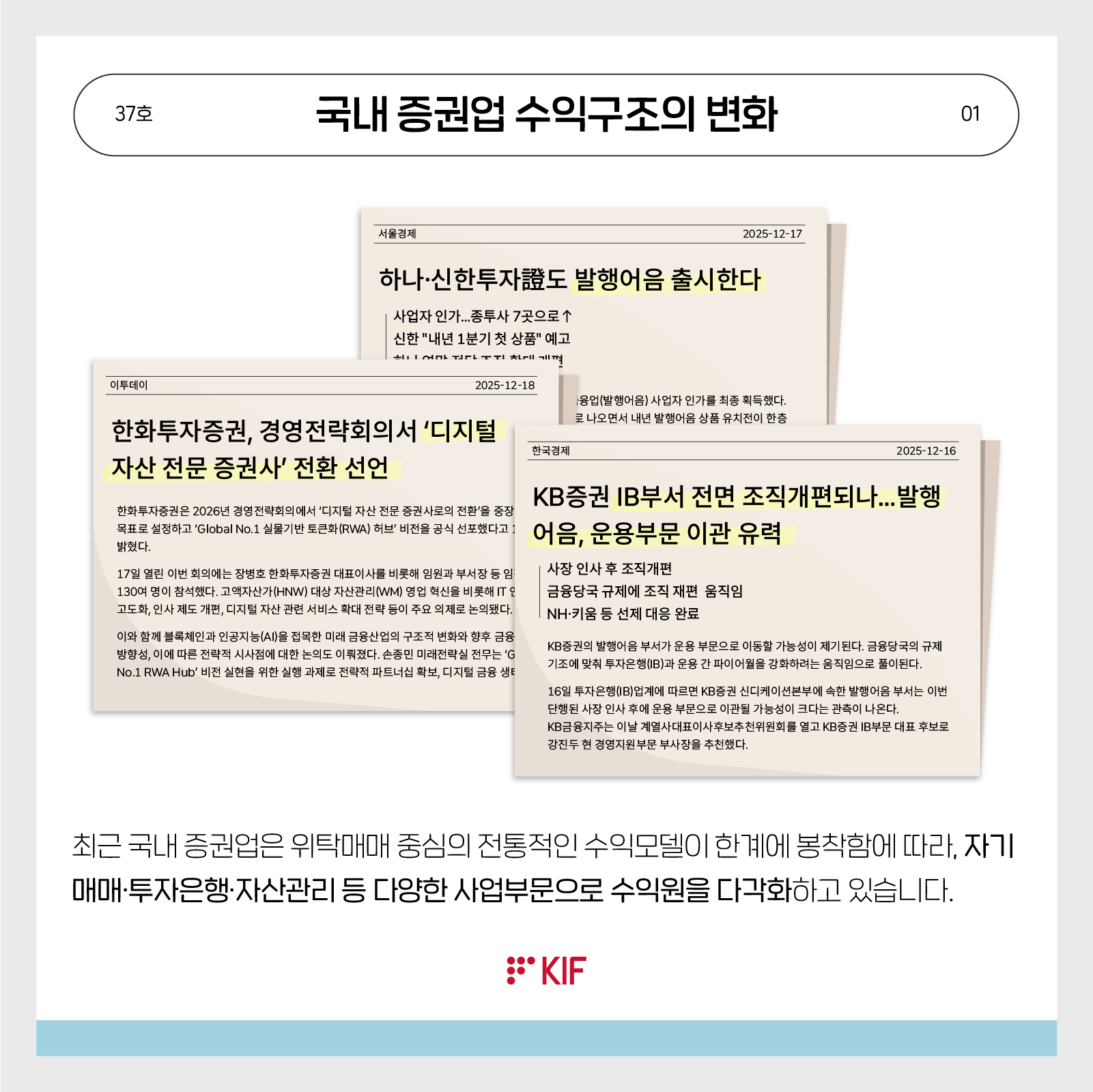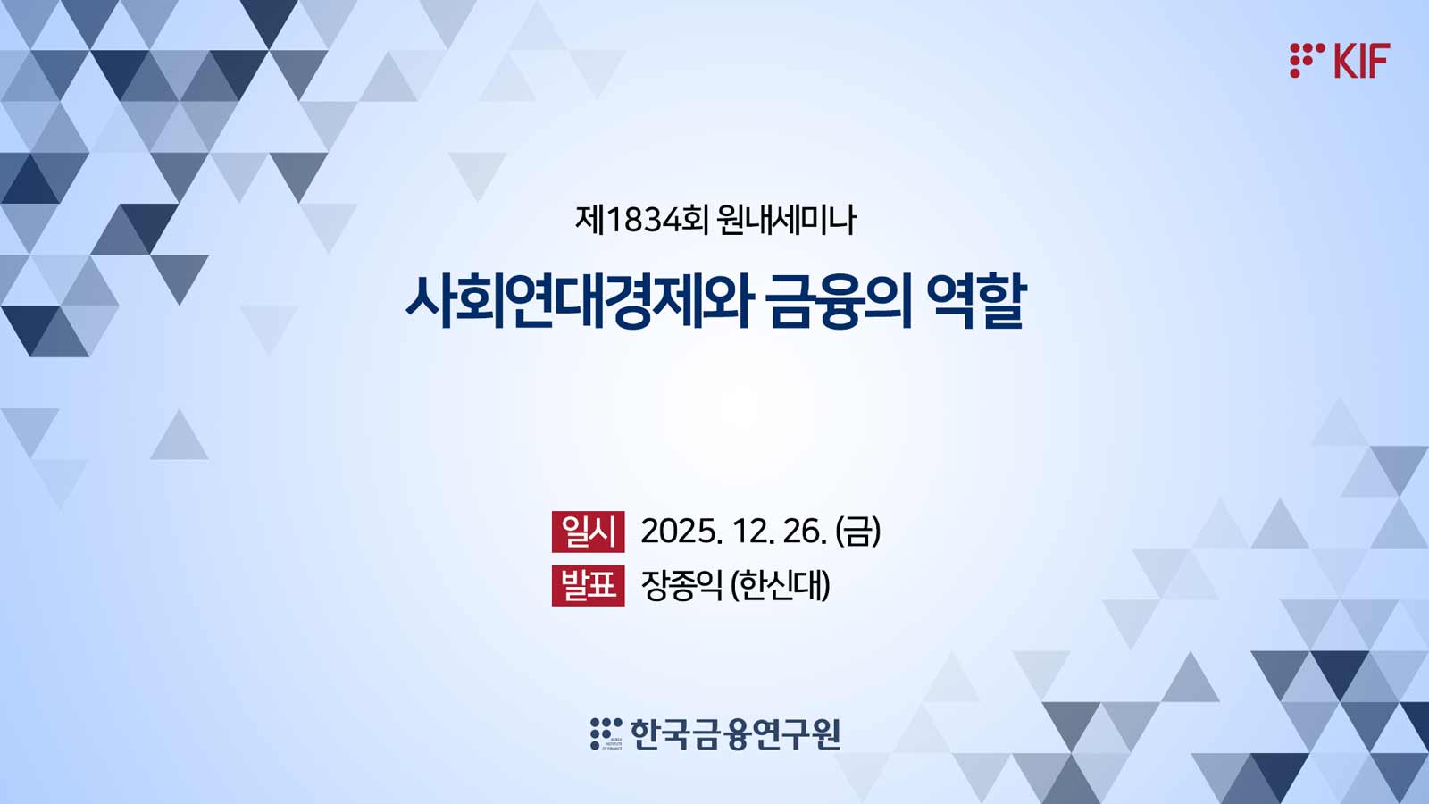 최근 경기전환점 발생 여부 추정머신러닝 알고리즘의 일종인 학습벡터양자화를 적용하여 최근의 공식 기준순환일(2020년 5월 저점) 이후의 경기전환 발생 여부를 추정하였음. 분석 결과 2022년 11월에 경기수축기에 진입하였었던 한국경제는 2025년 9월부터는 경기확장기로의 전환 가능성이 높아진 것으로 판단됨. 금융포커스 김현태인구구조 변화가 보험산업에 미치는 영향과 시사점최근 우리나라는 급격한 저출산·고령화를 경험해 왔으며, 이러한 인구구조 변화는 보험산업의 수익성, 성장성 등에 중대한 영향을 미칠 수 있음. 인구구조 변화는 보험산업에 해결해야 할 도전 과제를 제시하지만, 다른 한편으로는 새로운 사업 기회 창출을 위한 좋은 기회가 될 수도 있음. 향후 인구구조 변화에 효과적으로 대처하기 위해 국내 보험사들은 지속 가능한 성장과 장기적인 기업가치 제고를 위한 리스크관리 및 경영전략을 수립하고 추진해야 하며, 금융당국은 이를 지원할 제도적 여건을 마련할 필요가 있음. 금융포커스 한상용정부의 성장정책 패러다임과 주요 정책과제정부는 기술선도성장, 모두의 성장, 공정한 성장 등 슘페터식 3대 성장전략으로 모방성장전략의 한계로 인한 잠재성장률의 하락을 극복하고자 함. 새로운 성장전략이 성공하기 위해서는 슘페터식 성장의 전제조건인 첨단영역의 기술혁신, 지식 재산권 보호, 미래 혁신기업과 갈등을 빚을 수 있는 과거 혁신기업에 대한 공정경쟁 규제, 과감한 아이디어를 지원하는 생산적 금융이 필요함. 특히 생산적 금융이 성공적으로 이루어지기 위해서는 금융자원 배분의 효율성과 공정성 원칙이 유지되는 가운데, 정부출연 연구기관의 플랫폼 역할을 ... 금융포커스 김자봉일본 금융회사의 사모펀드 투자 확대와 리스크 관리상의 시사점최근 일본은행(BOJ)은 은행과 기관투자자들이 투융자를 통해 사모펀드와의 거래를 확대함에 따라 금융시스템에 대한 잠재적인 영향을 고려해 사모펀드에 대한 감독 강화의 필요성을 제기함. PE 펀드는 해외금리 상승에 따른 투자처 기업의 밸류에이션 저하와 차입금리 상승으로 인해 2022년경부터 수익률이 저하되고 있으며, PD 펀드는 펀드간 또는 은행 레버리지론과의 경합으로 인해 스프레드가 축소되고 있음. 일본은행은 투융자처 기업의 도산확률이 대체로 낮게 억제되고 있지만 향후 높은 금리수준 등이 지속될 경우 투융자처 기업... 해외 경제 및 금융 이슈 이병관국내 주요 정책 및 시장 동향주요 경제·금융동향 KIF