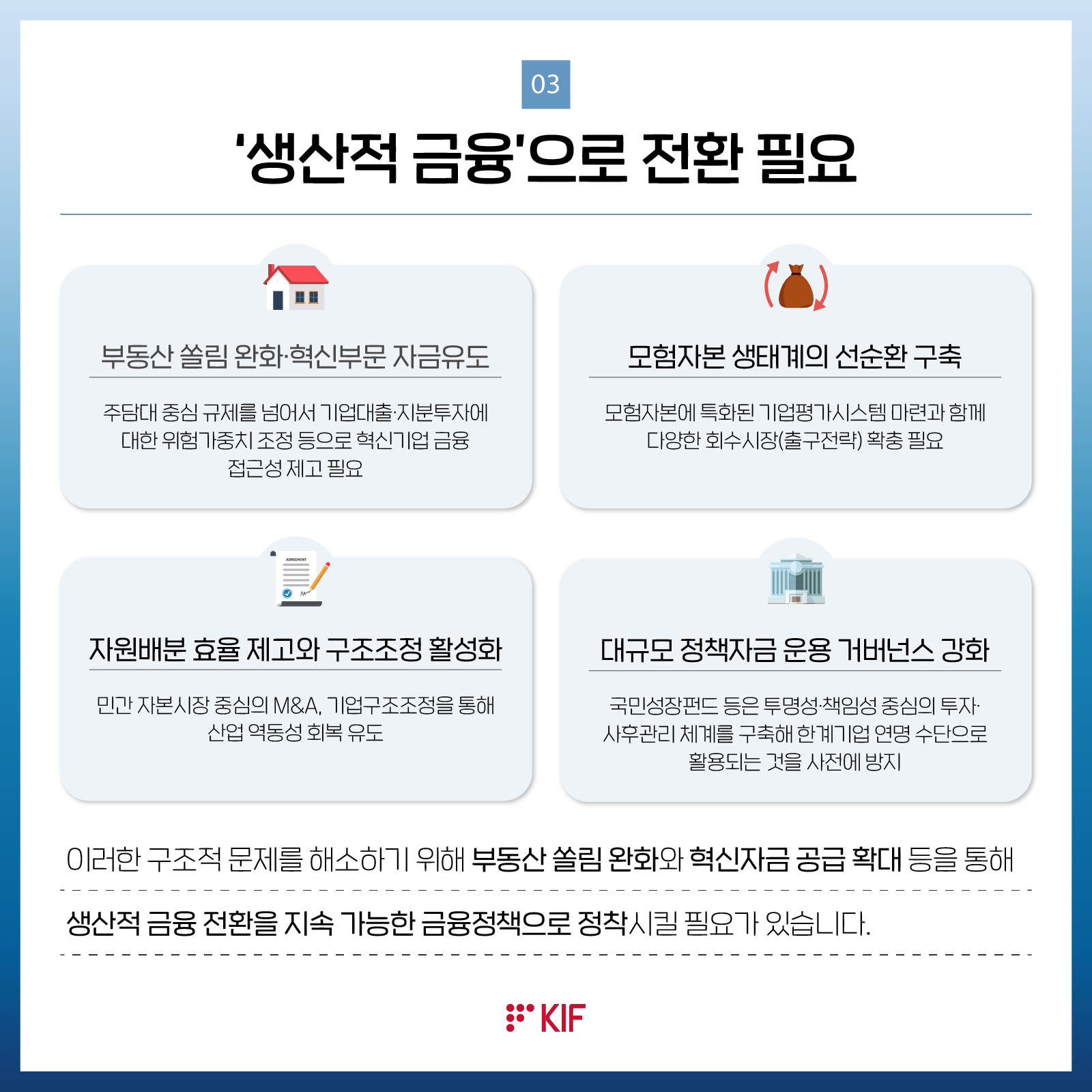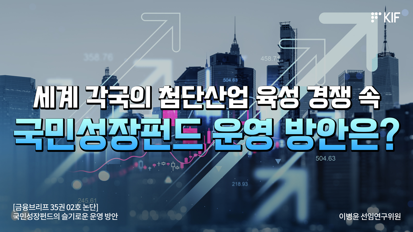 금융브리프금융브리프세계 각국의 첨단산업 육성 경쟁 속 국민성장펀드 운영 방안은?세계 각국은 AI·로봇·반도체 등 첨단전략산업 분야의 주도권을 선점하기 위해 총력을 다하고 있습니다. 저성장 고착화와 성장잠재력 둔화에 직면한 우리나라도 새로운 성장동력 확보를 위해 국민성장펀드를 출범시켰습니다. 국민성장펀드는 총 150조원 규모의 자금을 조성해 첨단전략산업과 해당 밸류체인, 지역성장 프로젝트 등을 지원할 예정입니다. 성공적인 운영을 위해서는 설립 목적에 충실한 자금 집행과 함께 민간 전문가 중심의 엄밀한 심사, 경쟁력 있는 기업 선별이 필수적입니다.특히 민간자금이 충분히 유입되는 분야에 정책자금이 투입되어 민간투자를 위축시키는 구축효과를 최소화하고, 기존 정책금융기관과의 중복지원을 줄이는 동시에 시너지효과를 극대화해야 합니다.아울러 운용 인력에 대한 면책과 인센티브를 강화하고, 질적 성과 중심의 평가 체계를 마련할 필요가 있습니다.첨단전략산업은 저성장 국면에 접어든 우리 경제의 새로운 돌파구가 될 것으로 기대되며, 이를 지원하기 위해 출범한 국민성장펀드에 거는 기대가 큽니다. 국민성장펀드가 당초 취지를 성공적으로 달성해 우리 경제의 지속 성장을 뒷받침하는 기반이 되기를 기대하겠습니다.