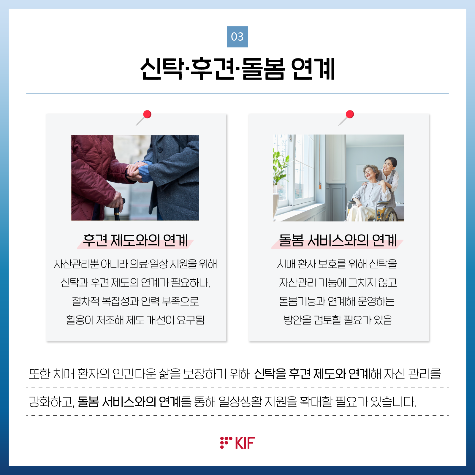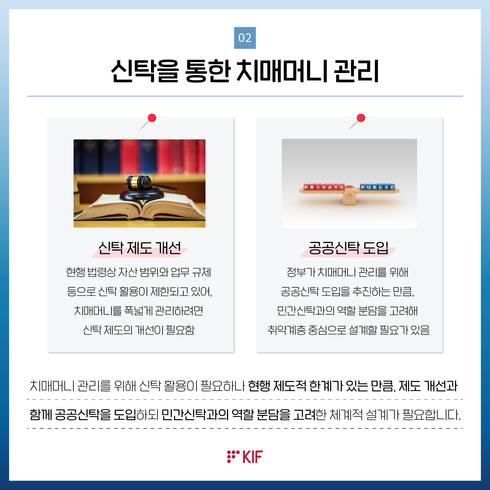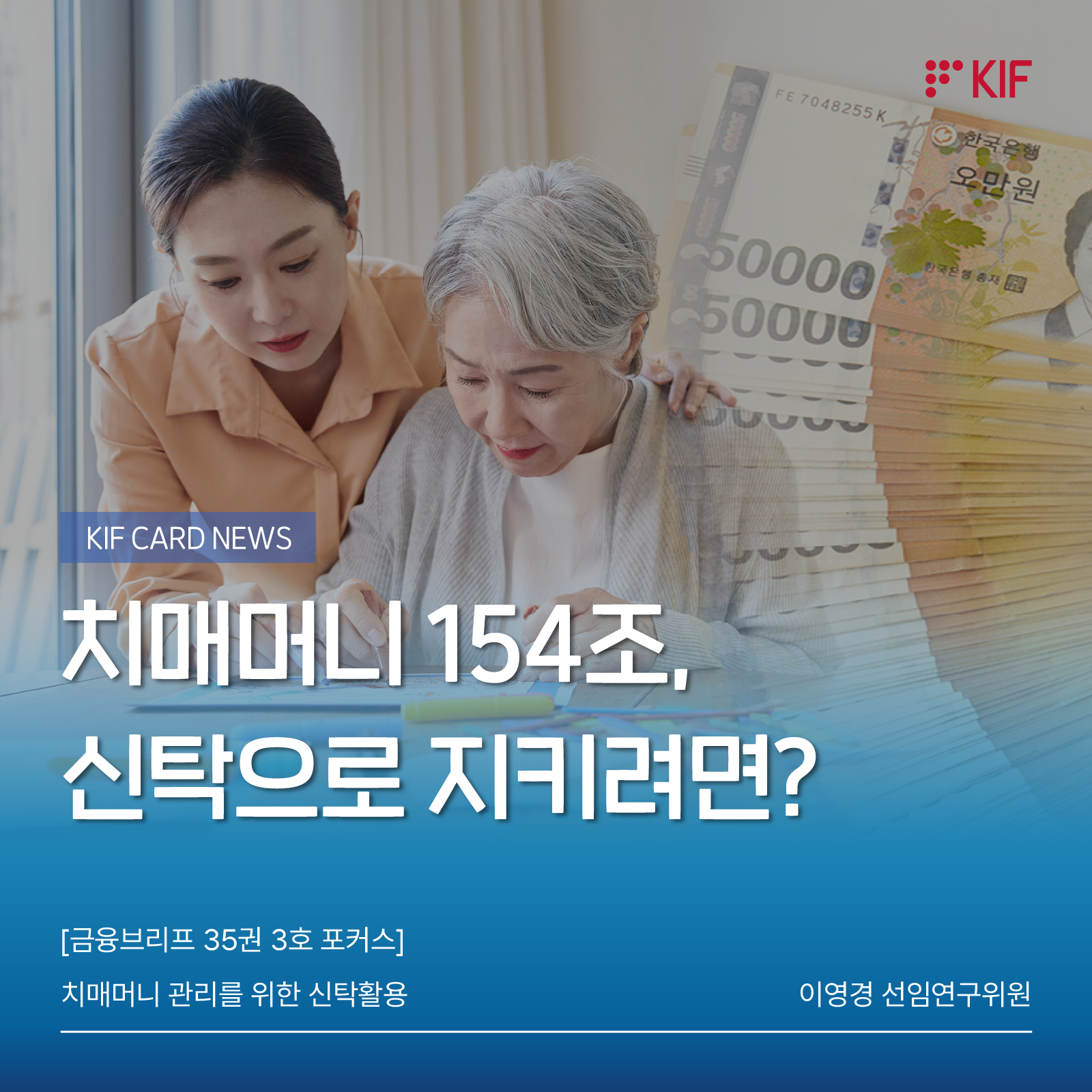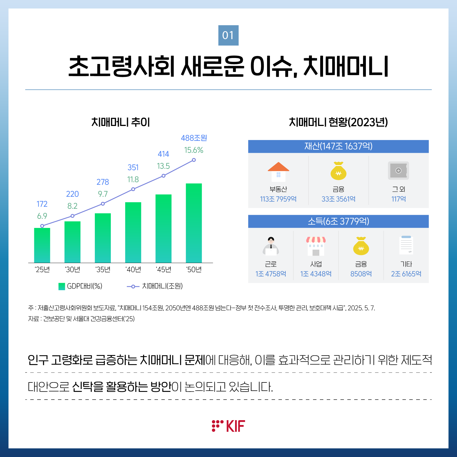 최근 초고령사회에 들어가면서 치매 환자 인구가 빠르게 늘고 있음. 치매 환자의 자산이 유휴화되고 생활 안정을 위하여 적절히 사용되지 못하는 치매머니 문제가 사회적으로 대두되어, 치매환자 자산을 효과적으로 관리하기 위한 제도 마련이 요구되고 있음. 이를 위해 신탁을 활용하는 것이 바람직하며, 공공신탁과 민간신탁의 조화, 후견 등 여타 제도와의 관계 등 다양한 측면에서 검토가 필요함.금융포커스이영경